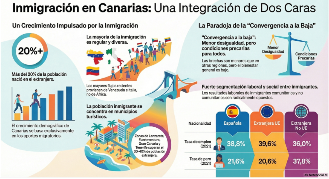 El Grupo de Investigación de la Cátedra Juan Miguel Sanjuán Demografía y Migración en Canarias hemos trabajado en un informe que detalla la situación de la inmigración en el mercado laboral de Canarias durante el periodo 2023-2024, destacando que la mano de obra extranjera se ha convertido en el pilar estructural para la sostenibilidad económica de las islas.